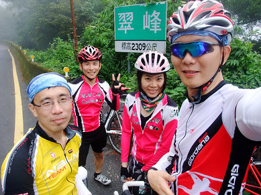 因為下雨的緣故, 武嶺的觀光客多已經下山, 我們三人趕緊把握時間把單車扛上武嶺的碑旁, 並麻煩還在上頭逗留的三位小女生幫我們拍照, 為今天的考驗做一個見證.
