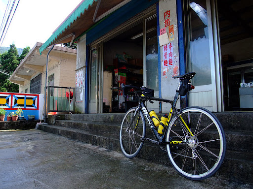 前方一個看起來很陡的髮夾彎, 看起來金財商店應該快到了, 於是我讓 JM 先走, 我先省點力, 慢慢的下車牽過這段坡後, 再上車騎到商店跟他會合. 到了金財商店時, 時間已經是九點半了.